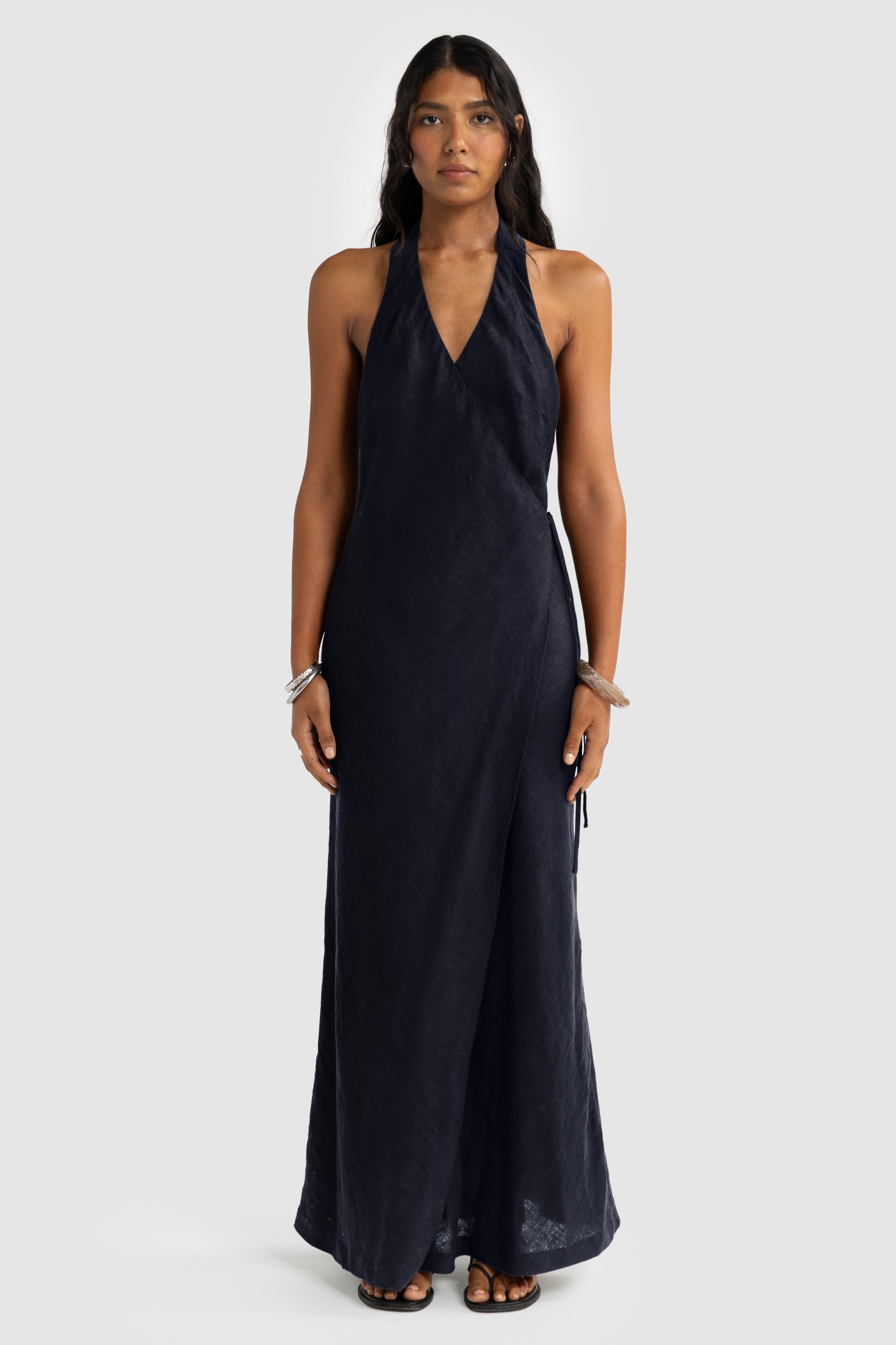 Elegant and effortless, the Elise Wrap Full Length Dress is designed for timeless sophistication. Featuring a halter neck silhouette with a deep V neckline and an open back, this dress ties neatly at the waist to create a flattering wrap effect. The Elise offers breathable comfort and a soft drape that moves beautifully with the body — perfect for both elevated daywear and evening occasions.