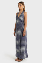 Elise Linen Wrap Full Length Dress Harbour Blue Polkadot