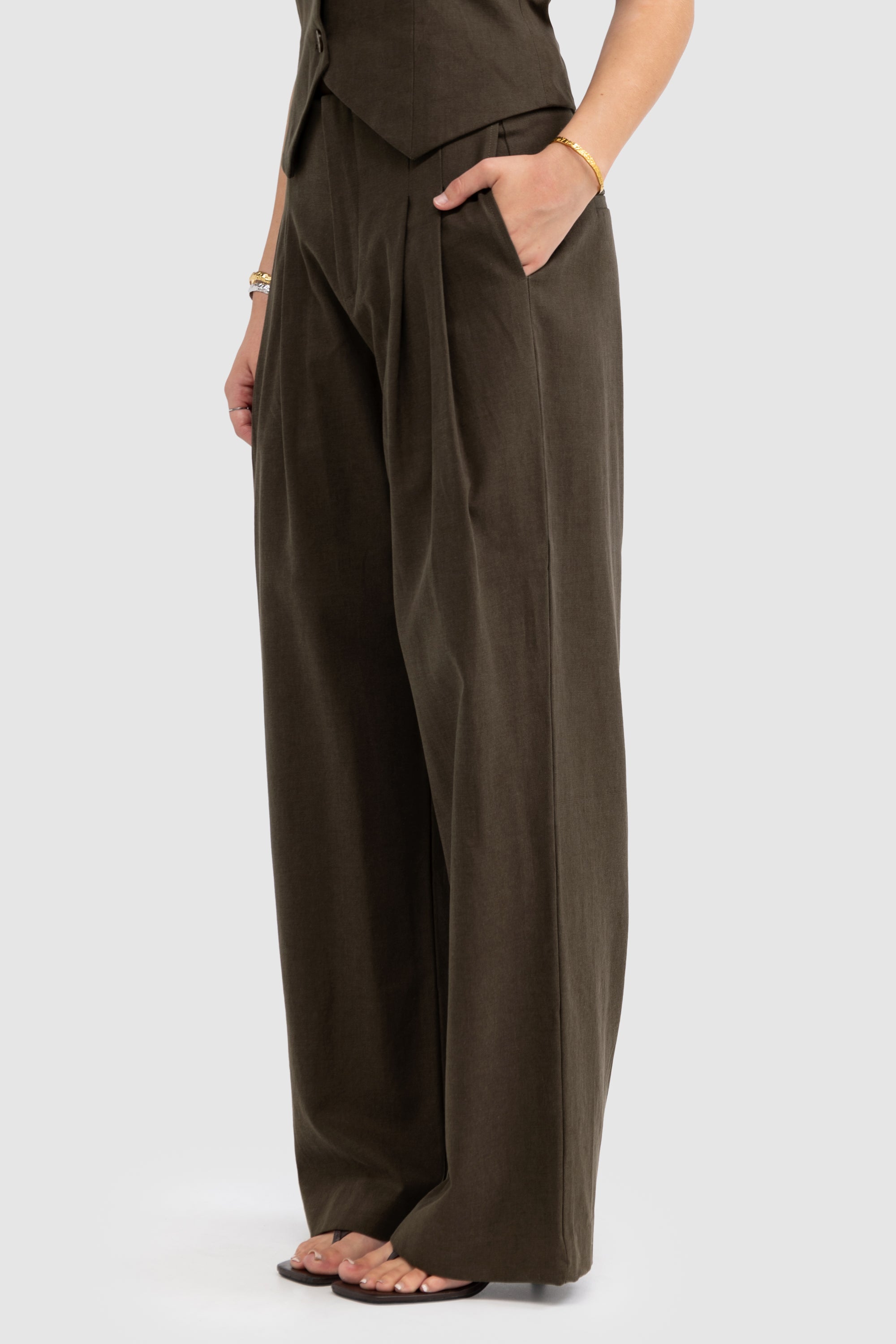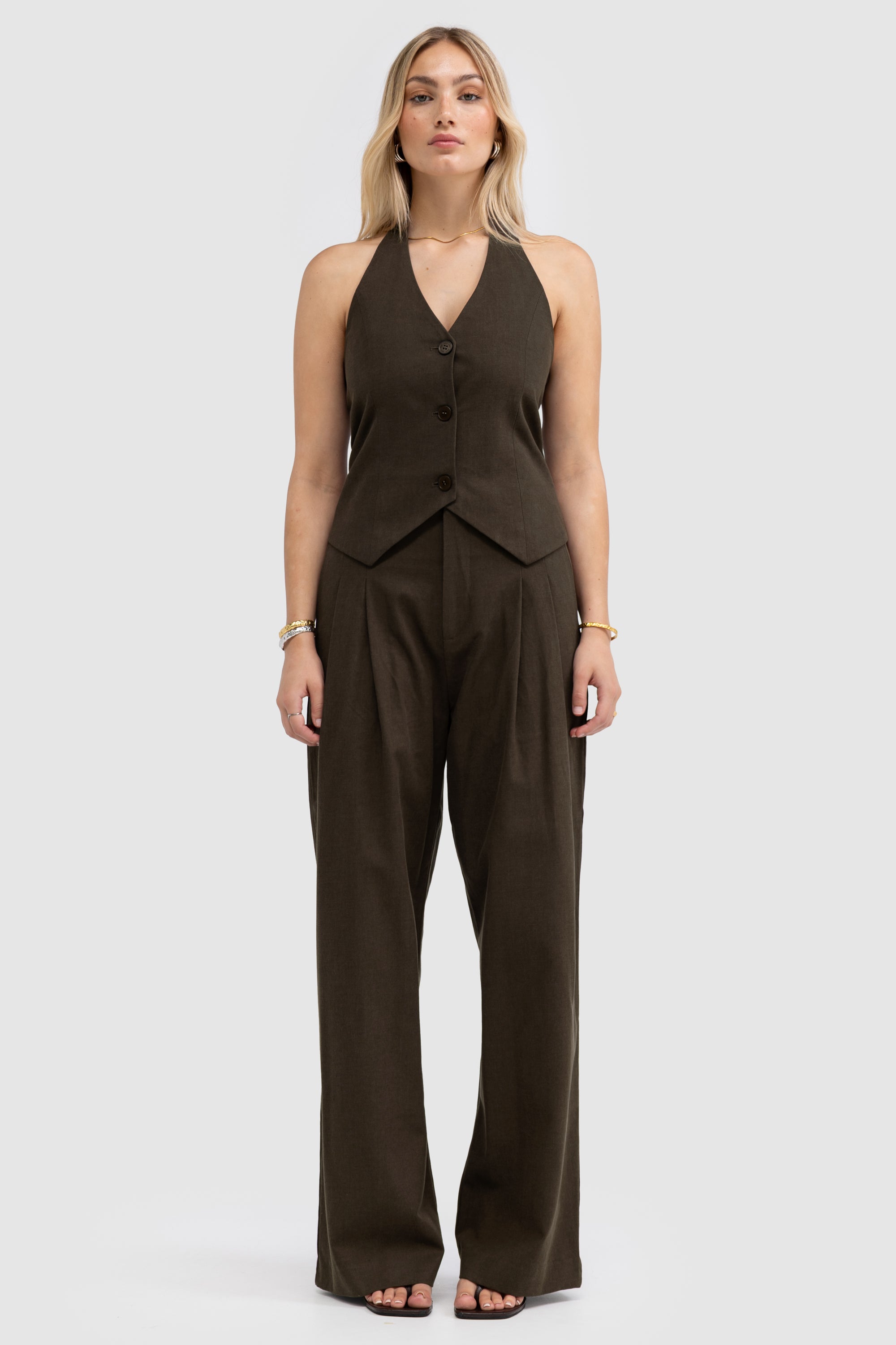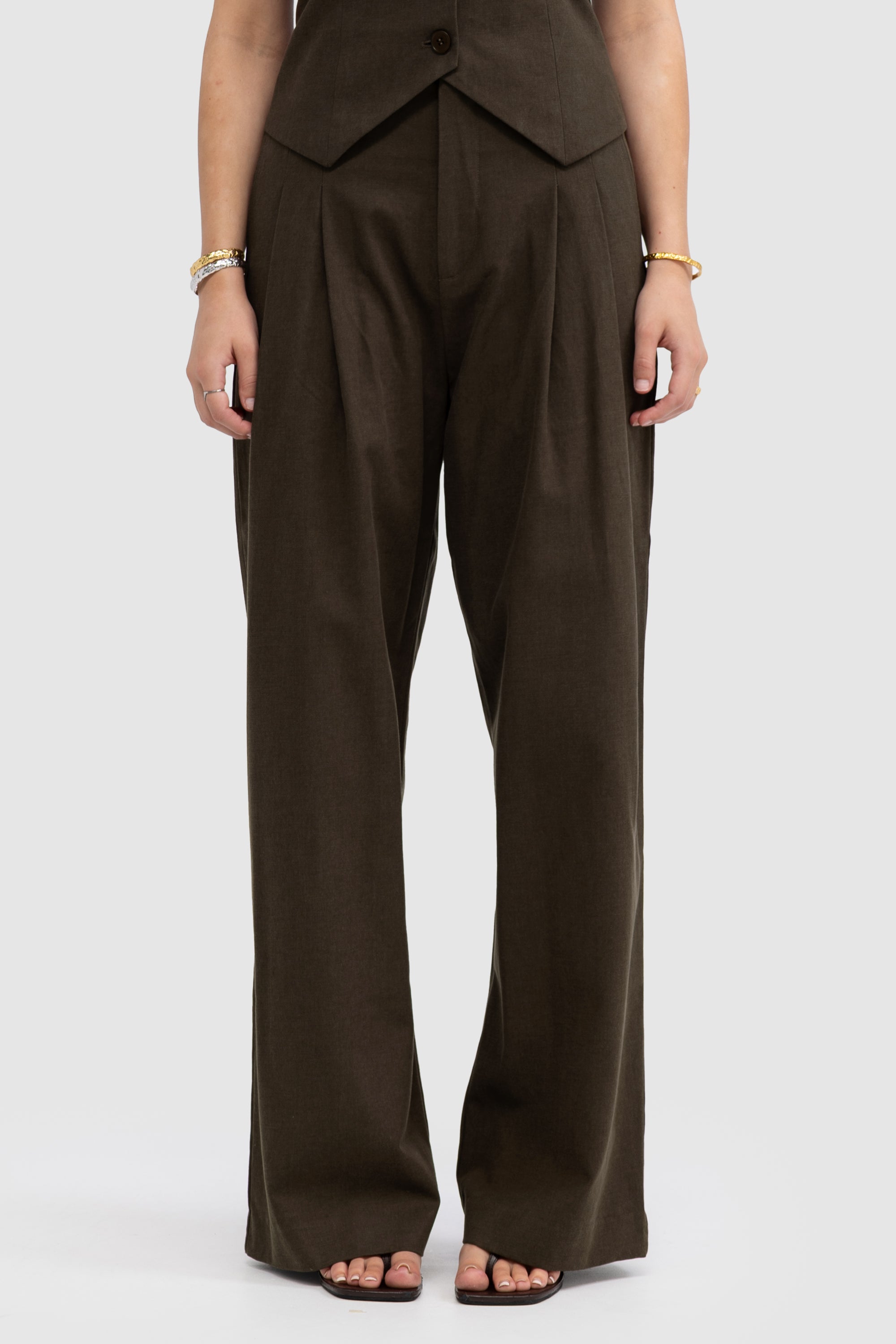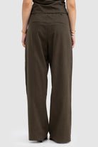 The Aubrey Pant in Cedar is a refined staple that blends structure with effortless style. Cut from a soft suiting-style fabric, it features a high-rise fit with subtle front pleats and a relaxed, wide-leg silhouette. A tailored waistband and belt detail adds definition, while an elasticated back panel offers a effortless style.