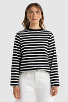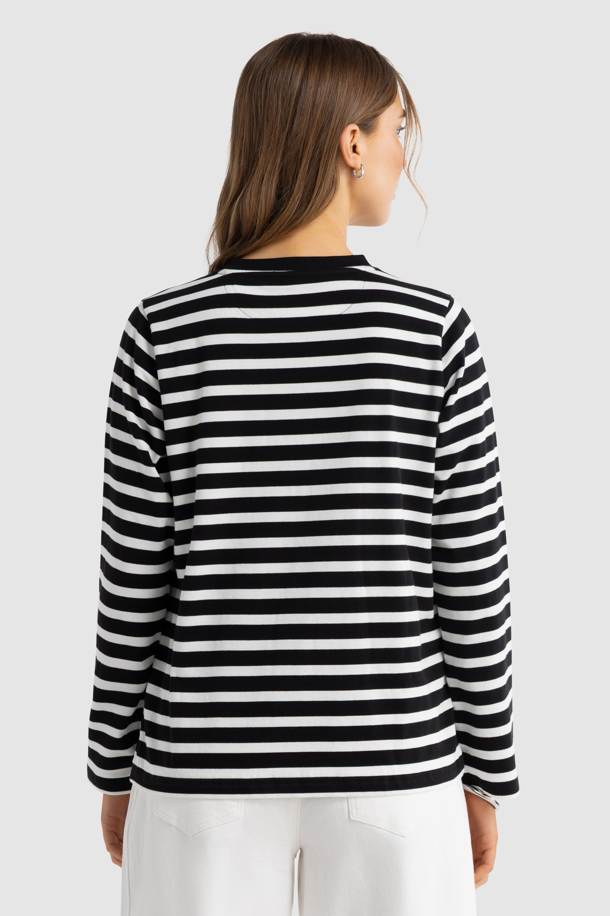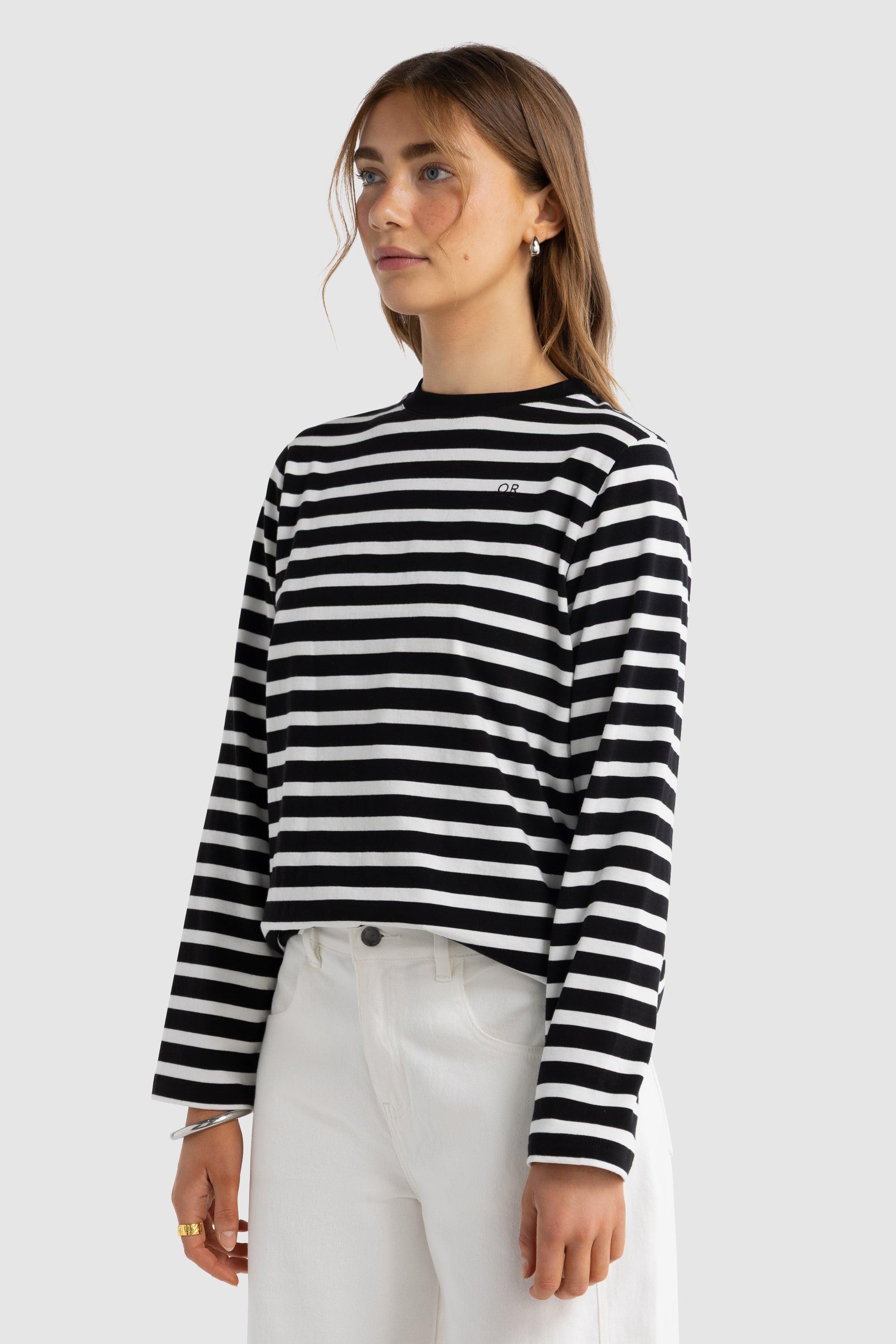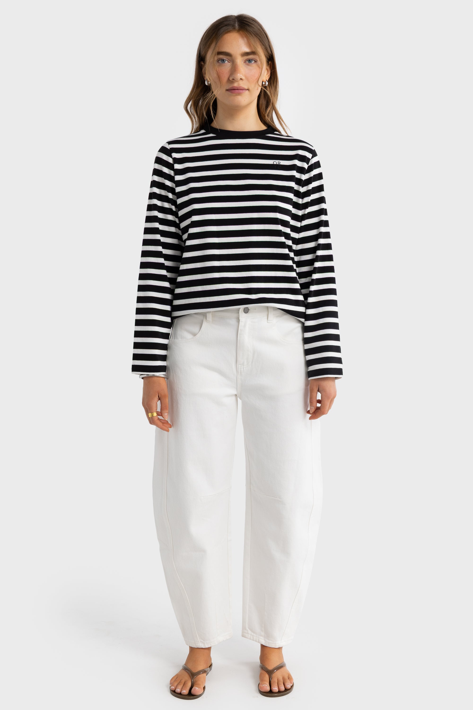 The Clara Long Sleeve T-Shirt is a refined everyday essential designed for ultimate comfort and versatility. Crafted from soft, breathable cotton, it features a relaxed silhouette that drapes effortlessly on the body. The classic stripe design is elevated with a contrasting neckline and a clean, embroidered ORTC stacked logo at the chest for a subtle touch of branding.