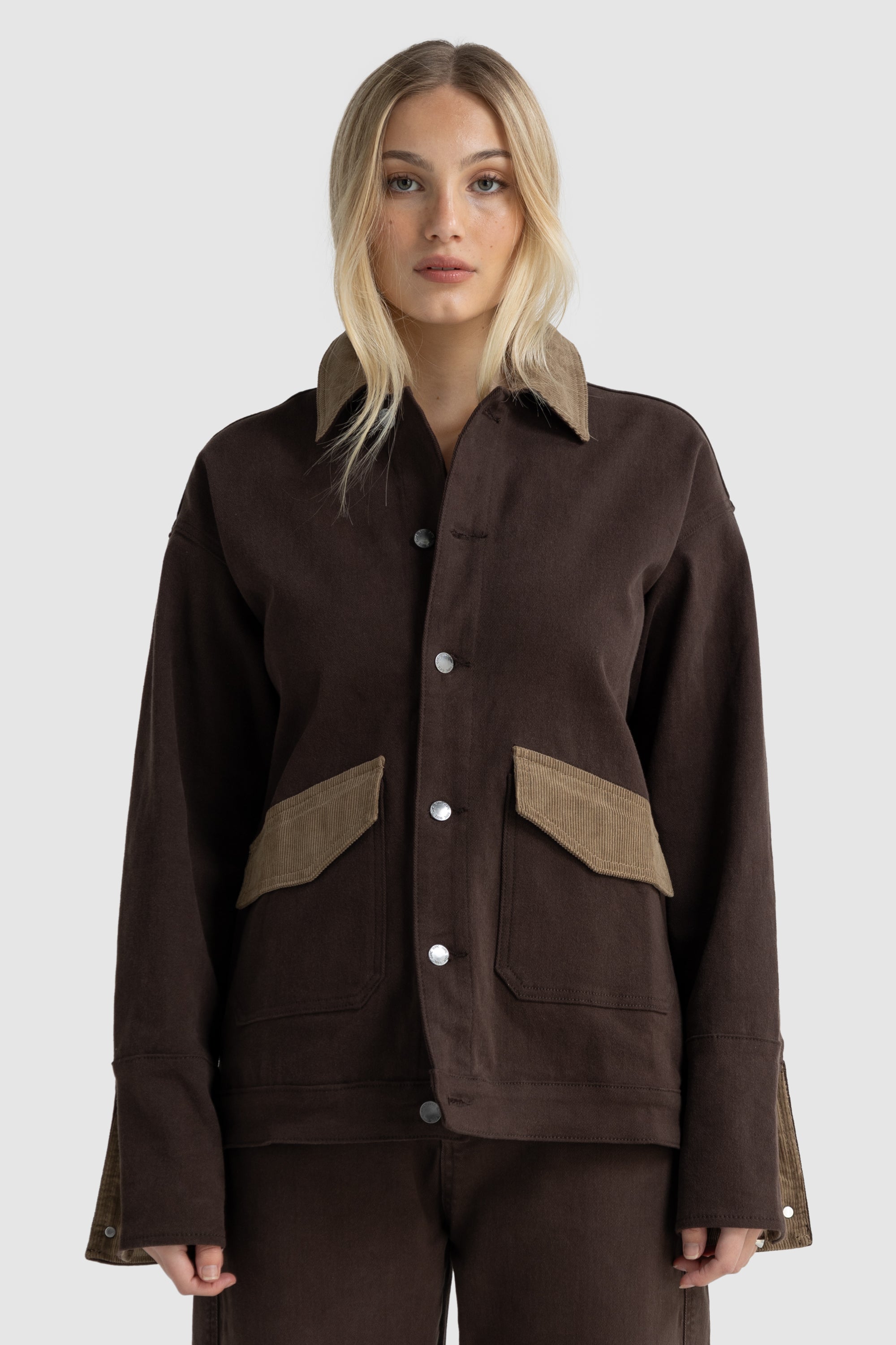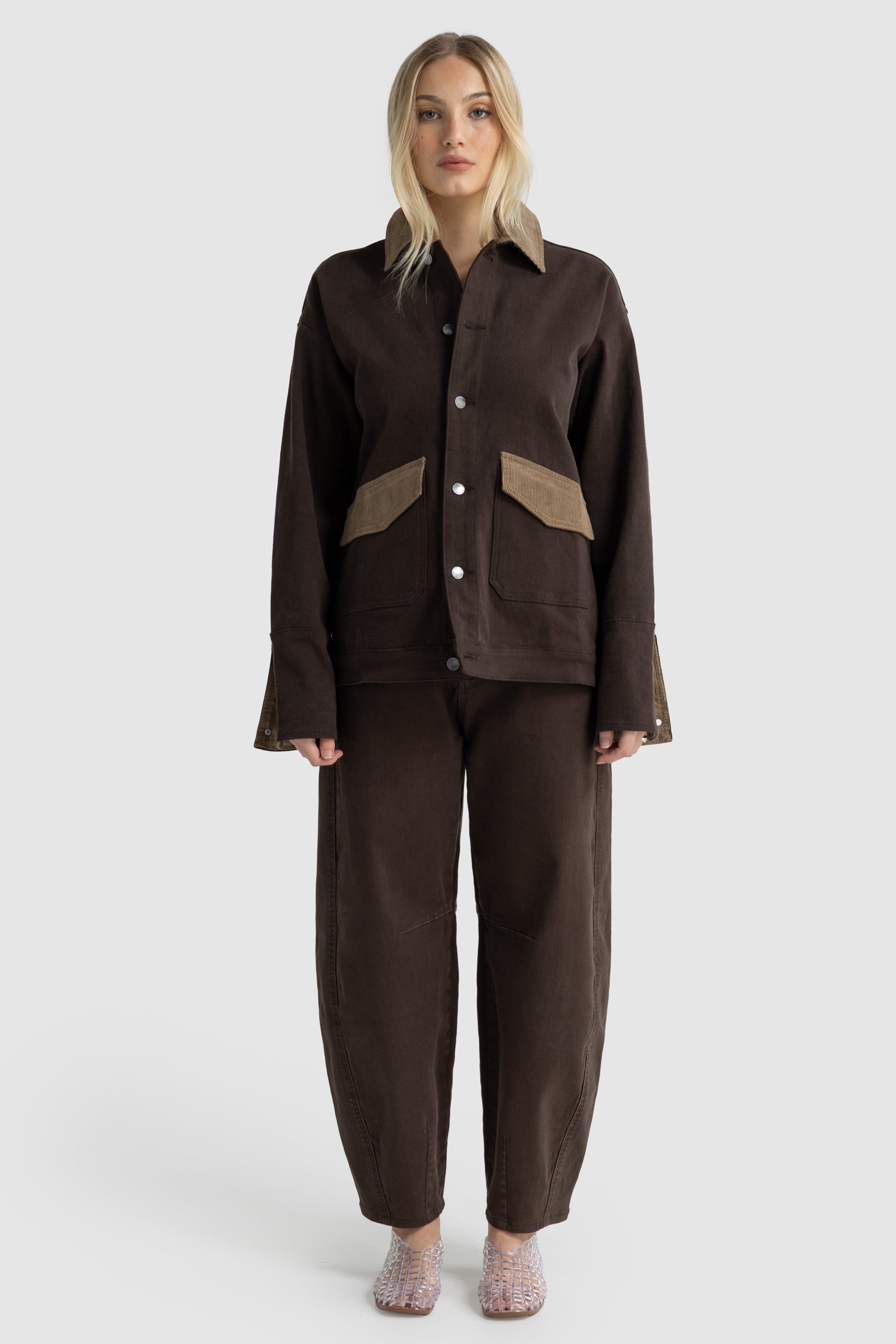 The Dover Contrast Jacket in Cacao is a timeless essential reimagined. Crafted from mid-weight, non-stretch cotton denim, this relaxed, oversized jacket features contrast corduroy detailing at the collar, front pocket, and inside cuffs. A modern take on the classic blue denim jacket, its warm neutral tone and thoughtful finishes make it an easy layering piece for any wardrobe. Pair it with the matching Dover Barrel Leg Jean in Cacao for the full tonal look.