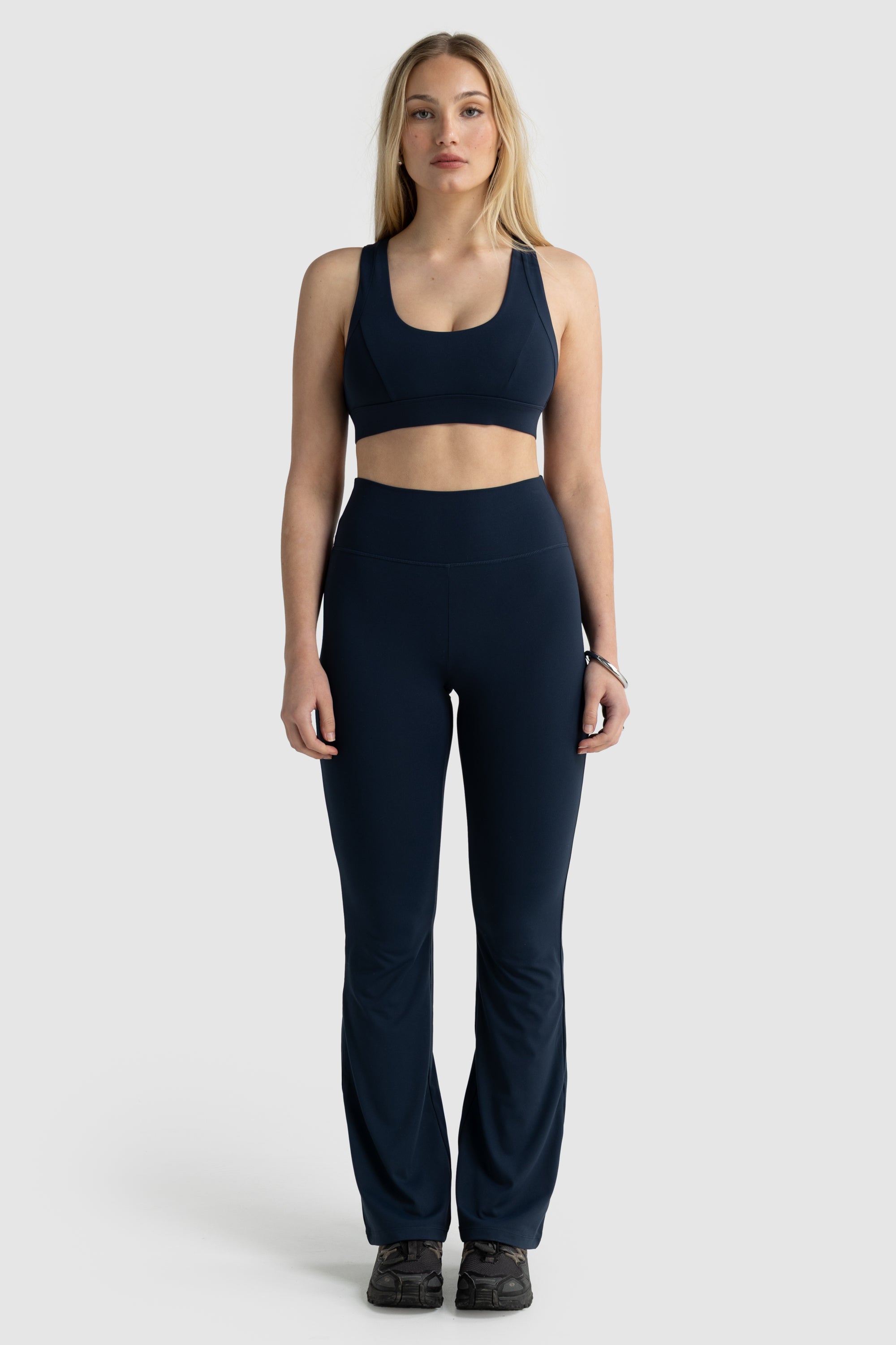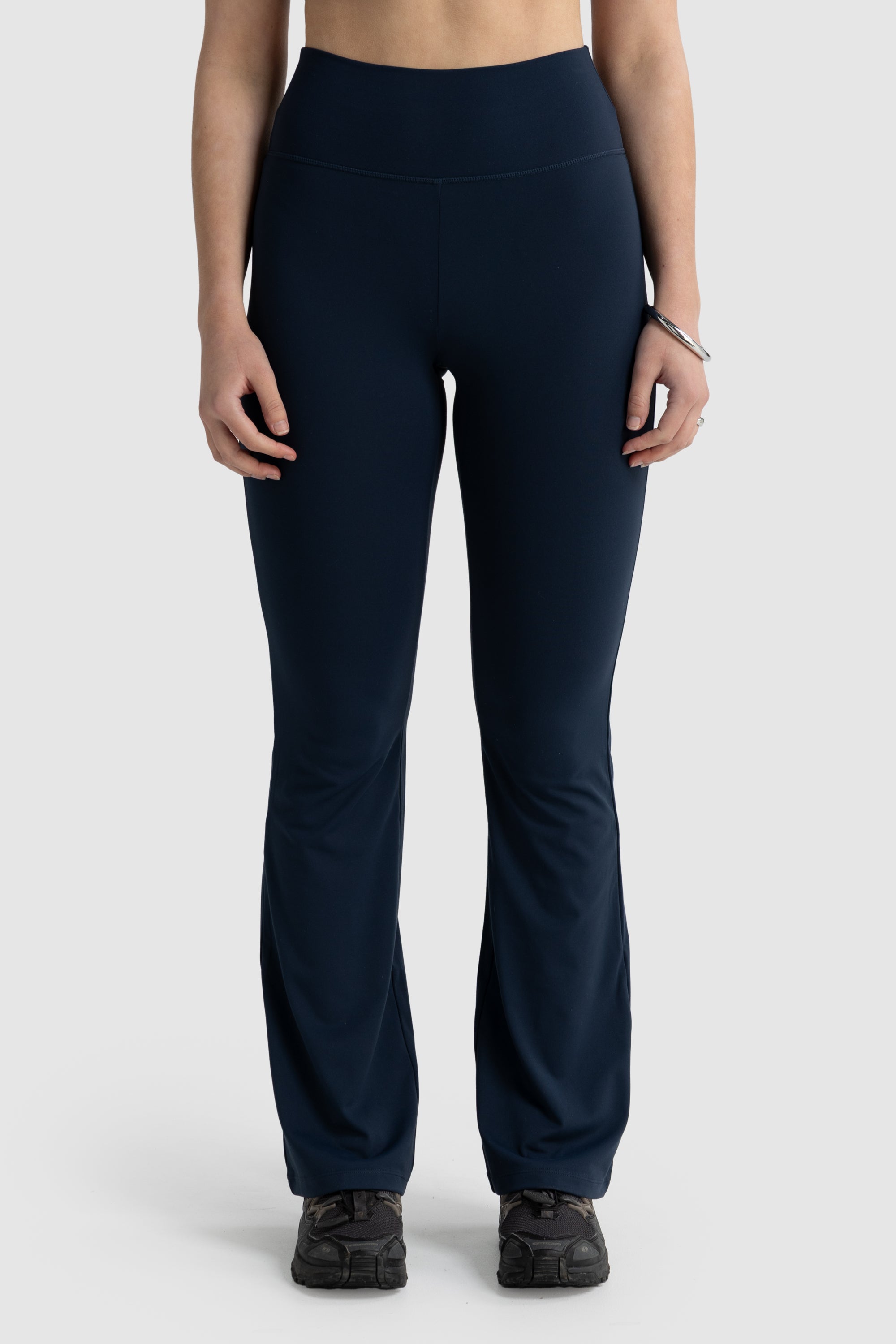 Features a high double-layered waistband and a versatile slight flare leg for a flattering silhouette designed to hug you in all the right places.