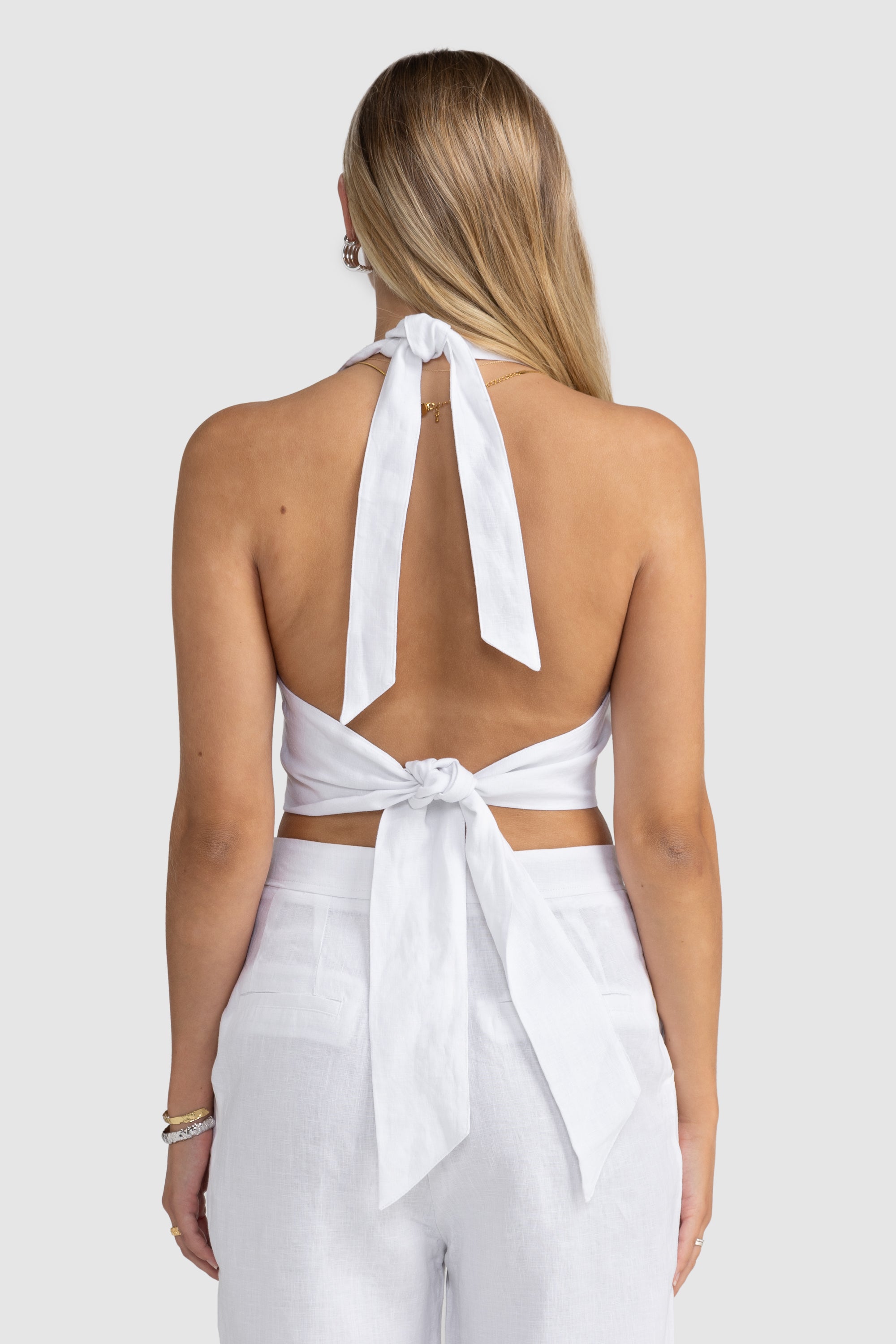 Indulge in the sophistication of our Lucy Linen Halter Top White, with a fully adjustable Halter neck tie and waist tie to enhance the fit for all body types. Its square neckline and v point hem add a touch of artful elegance to this versatile addition to your wardrobe.