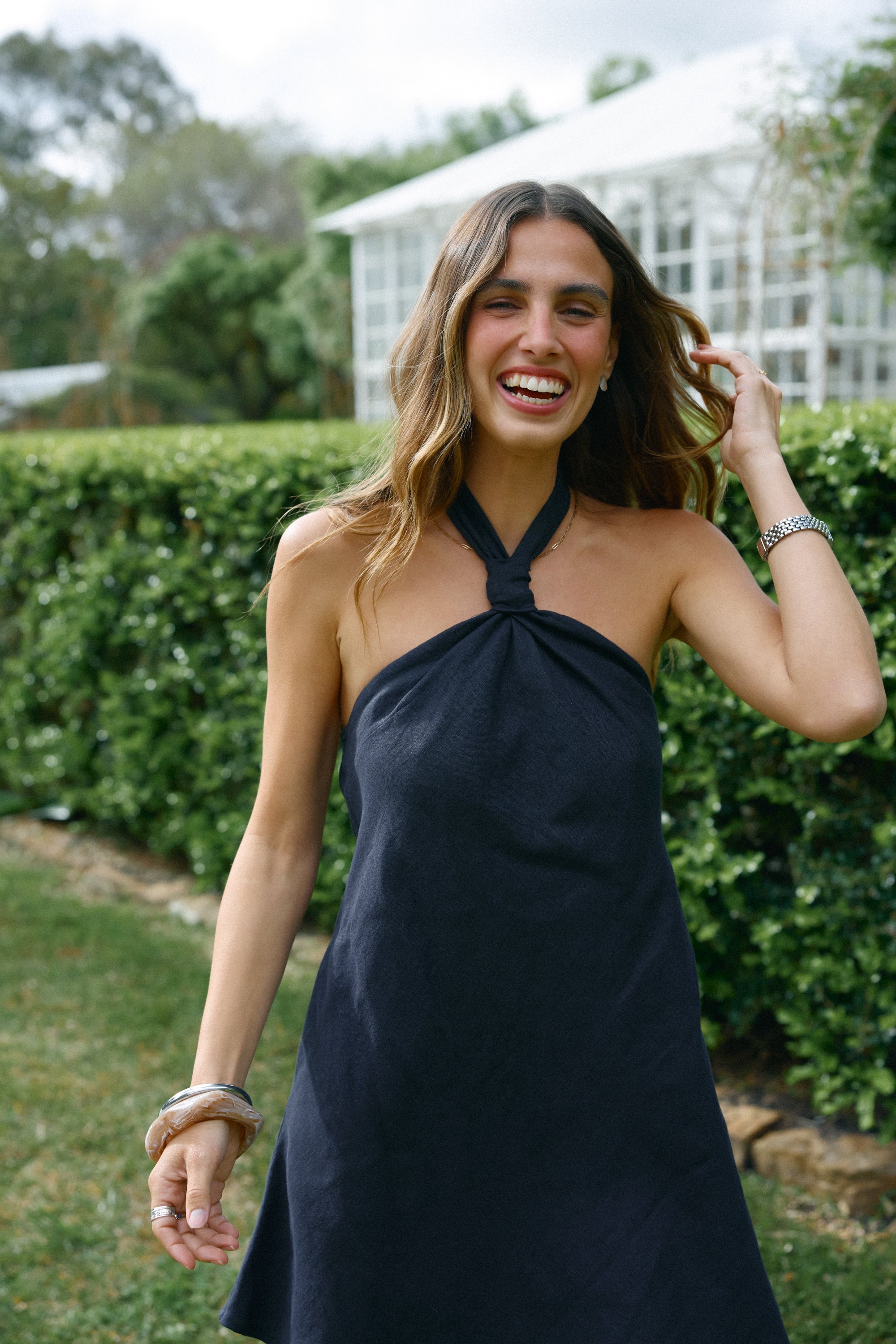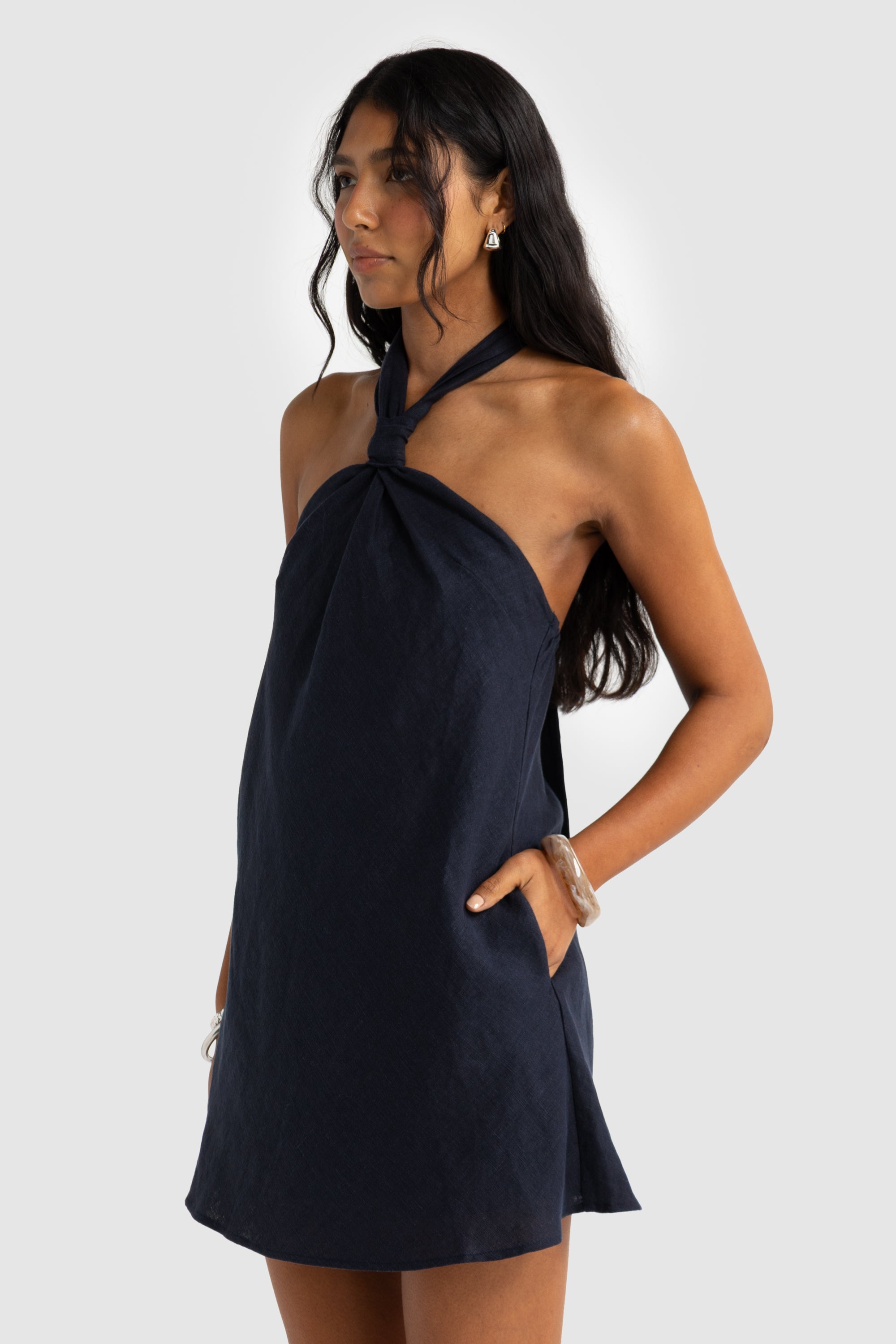 Elevate your holiday wardrobe with the new Mira Linen Halter Mini Dress. Crafted from 100% linen, this lightweight mini features a relaxed fit and adjustable wrap-around halter neck for effortless summer style. The backless design and elasticated back panel offer comfort and flexibility, while practical pockets add a thoughtful detail. A go-to piece for warm days and balmy nights.