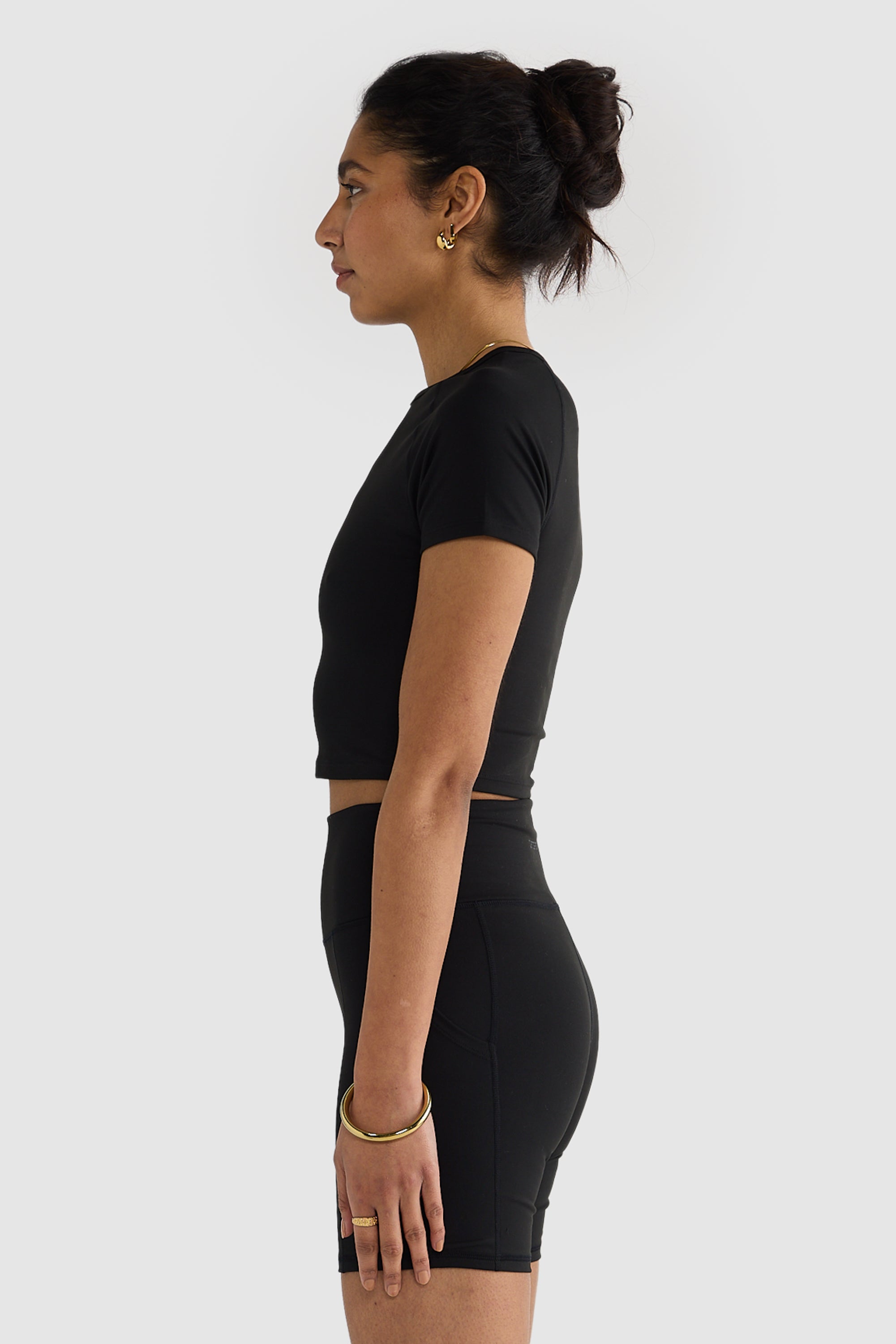 The Eva Short Sleeve Crop Top Black is a wardrobe staple. Crafted from an ultra soft double brushed fabric, you will be reaching for this top when both lounging and working out.